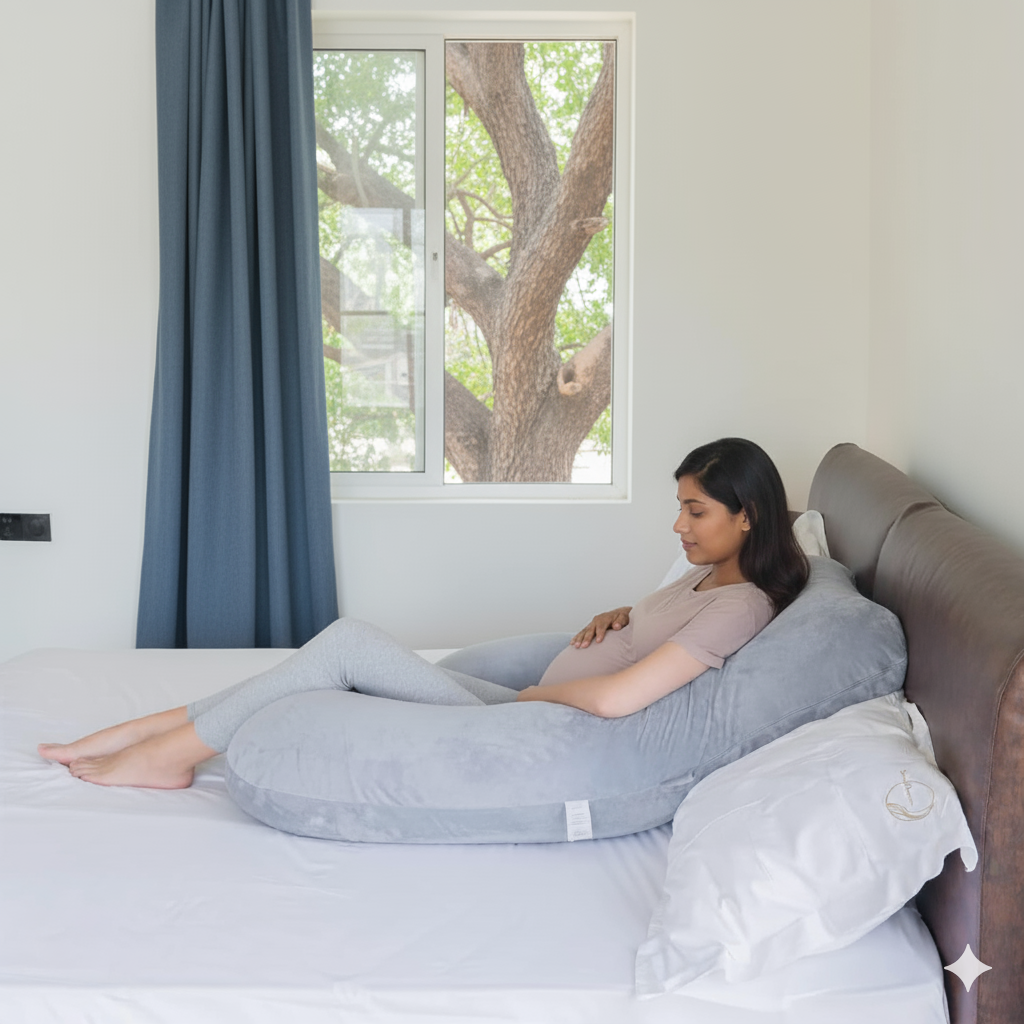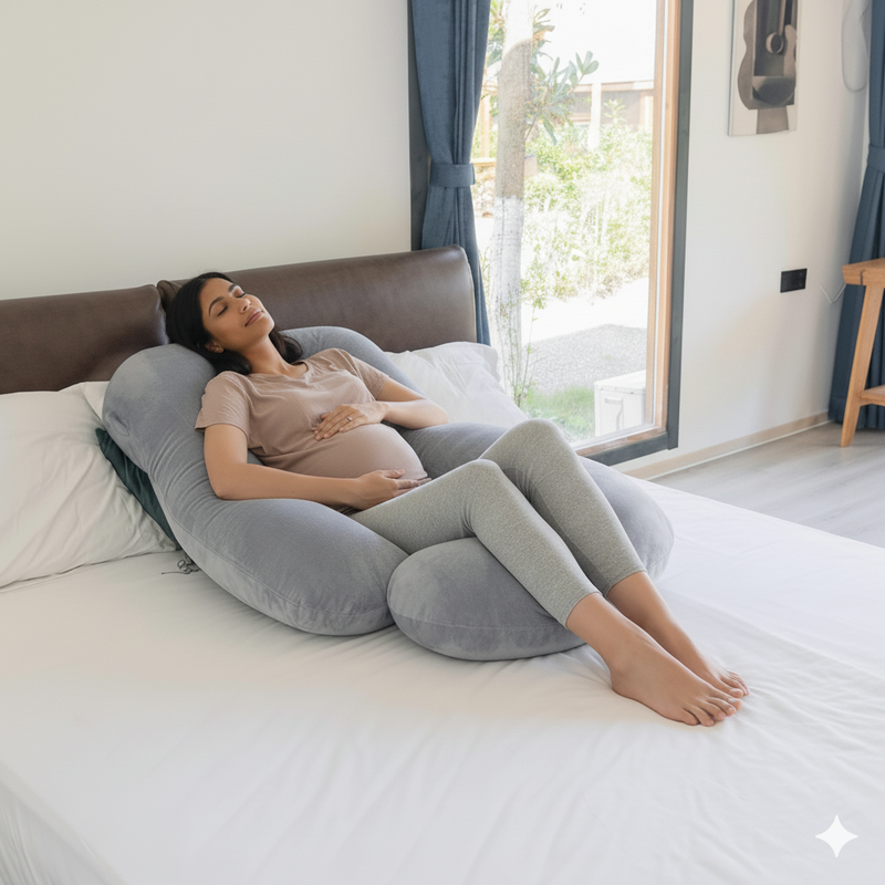 Our Premium Pregnancy Pillow Range surrounds you with full-body support designed for restful sleep throughout pregnancy. Wrapped in a velvety-soft Indian velour cover, it offers dependable comfort night after night. While it’s slightly firmer and less plush than our Cozy Plush collection, it provides targeted relief exactly where you need it — helping you drift into a supported, comfortable position.